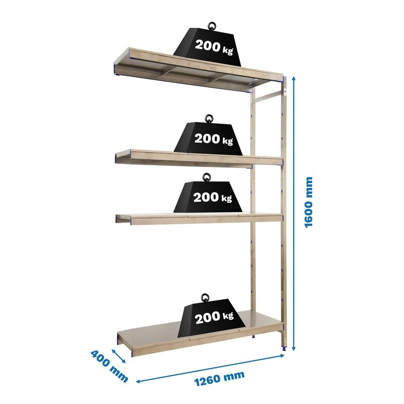 Estantería adicional de acero inoxidable que aguanta hasta 30º bajo cero y es perfecta para la organización y manipulación de alimentos.El módulo adicional necesita añadirse a un módulo inicial para completar su instalación. Esta Estantería tiene 4 estantes y sus bandejas tienen una capacidad de carga de 200 kgs cada una. El montaje es muy sencillo y rápido con su sistema sin tornillos y tiene unas dimensiones de 1600x1260x400 mms.