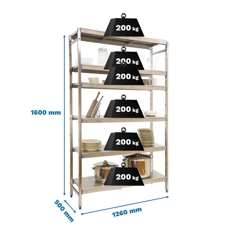 Estantería de acero inoxidable que aguanta hasta 30º bajo cero y es perfecta para la organización y manipulación de alimentos. Esta Estantería tiene 6 estantes y sus bandejas tienen una capacidad de carga de 200 kgs cada una. El montaje es muy sencillo y rápido con su sistema sin tornillos y tiene unas dimensiones de 1600x1260x500 mms.
