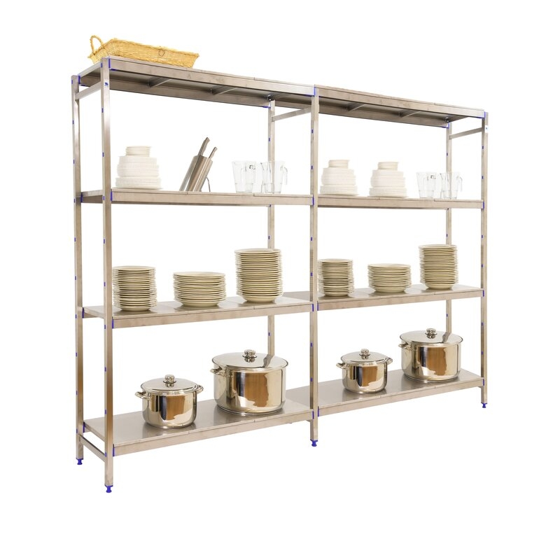 Estantería de acero inoxidable que aguanta hasta 30º bajo cero y es perfecta para la organización y manipulación de alimentos. Esta Estantería tiene 4 estantes y sus bandejas tienen una capacidad de carga de 200 kgs cada una. El montaje es muy sencillo y rápido con su sistema sin tornillos y tiene unas dimensiones de 1600x3290x400 mms.