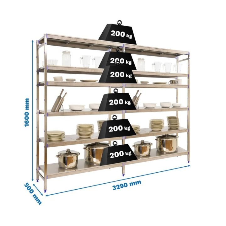 Estantería de acero inoxidable que aguanta hasta 30º bajo cero y es perfecta para la organización y manipulación de alimentos. Esta Estantería tiene 6 estantes y sus bandejas tienen una capacidad de carga de 200 kgs cada una. El montaje es muy sencillo y rápido con su sistema sin tornillos y tiene unas dimensiones de 1600x3290x500 mms.