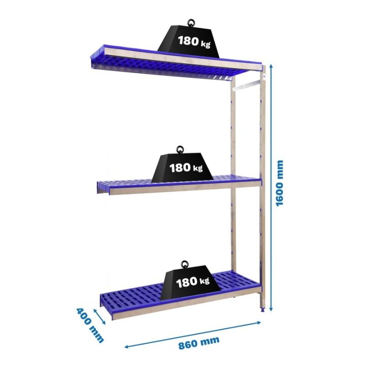 Estantería adicional de acero inoxidable y bandejas de polipropileno que aguanta hasta 30º bajo cero y es perfecta para la organización y manipulación de alimentos.El módulo adicional necesita uno inicial para completar su instalación. Esta Estantería tiene 3 estantes y sus bandejas tienen una capacidad de carga de 180 kgs cada una. El montaje es muy sencillo y rápido con su sistema sin tornillos y tiene unas dimensiones de 1600x860x400 mms.