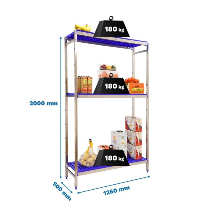 Estantería de acero inoxidable y bandejas de polipropileno que aguanta hasta 30º bajo cero y es perfecta para la organización y manipulación de alimentos. Esta Estantería tiene 3 estantes y sus bandejas tienen una capacidad de carga de 180 kgs cada una. El montaje es muy sencillo y rápido con su sistema sin tornillos y tiene unas dimensiones de 2000x1260x500 mms.