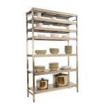 Estantería de acero inoxidable que aguanta hasta 30º bajo cero y es perfecta para la organización y manipulación de alimentos. Esta Estantería tiene 7 estantes y sus bandejas tienen una capacidad de carga de 200 kgs cada una. El montaje es muy sencillo y rápido con su sistema sin tornillos y tiene unas dimensiones de 2000x1260x500 mms.