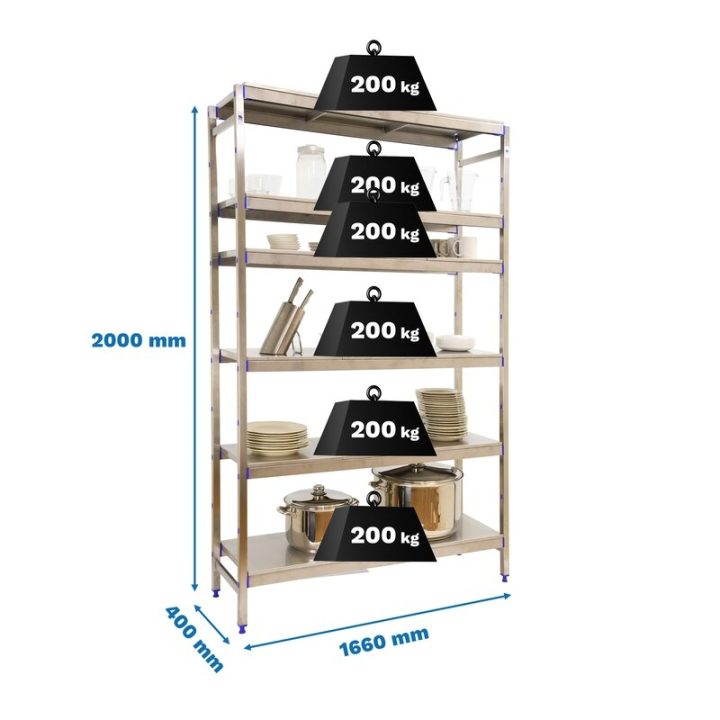 Estantería de acero inoxidable que aguanta hasta 30º bajo cero y es perfecta para la organización y manipulación de alimentos. Esta Estantería tiene 6 estantes y sus bandejas tienen una capacidad de carga de 200 kgs cada una. El montaje es muy sencillo y rápido con su sistema sin tornillos y tiene unas dimensiones de 2000x1660x400 mms.