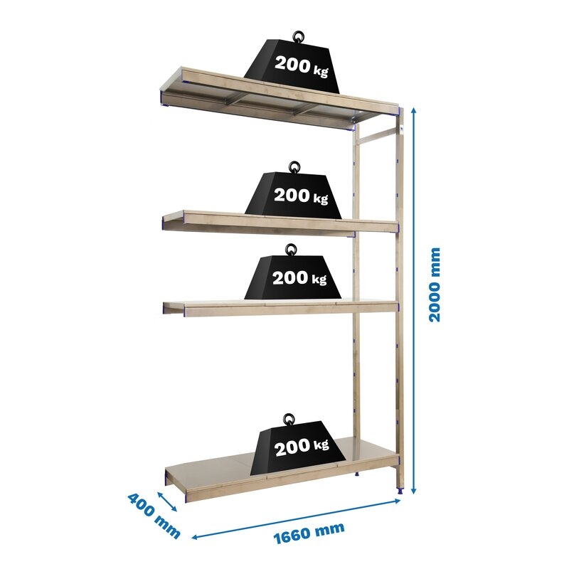 Estantería adicional de acero inoxidable que aguanta hasta 30º bajo cero y es perfecta para la organización y manipulación de alimentos.El módulo adicional necesita añadirse a un módulo inicial para completar su instalación. Esta Estantería tiene 4 estantes y sus bandejas tienen una capacidad de carga de 200 kgs cada una. El montaje es muy sencillo y rápido con su sistema sin tornillos y tiene unas dimensiones de 2000x1660x400 mms.