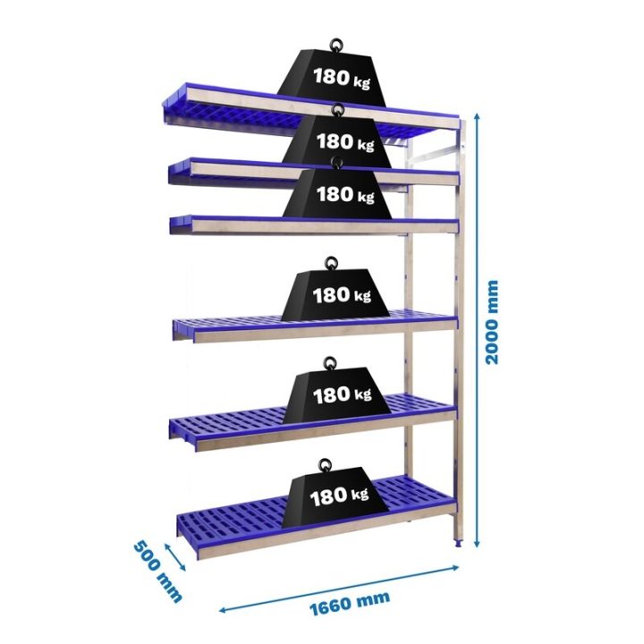 Estantería adicional de acero inoxidable y bandejas de polipropileno que aguanta hasta 30º bajo cero y es perfecta para la organización y manipulación de alimentos.El módulo adicional necesita uno inicial para completar su instalación. Esta Estantería tiene 6 estantes y sus bandejas tienen una capacidad de carga de 180 kgs cada una. El montaje es muy sencillo y rápido con su sistema sin tornillos y tiene unas dimensiones de 2000x1660x500 mms.