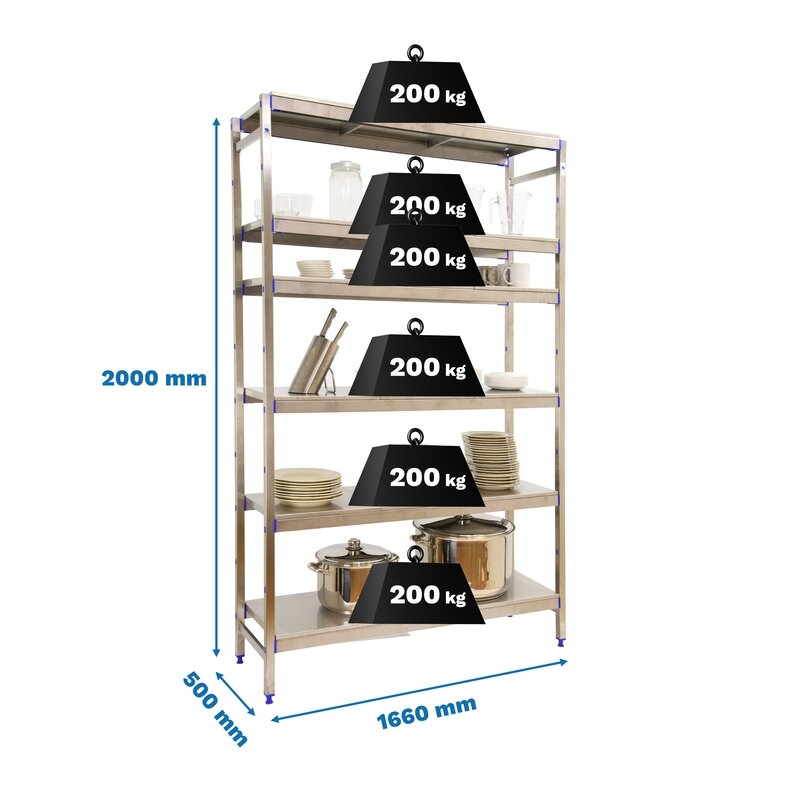 Estantería de acero inoxidable que aguanta hasta 30º bajo cero y es perfecta para la organización y manipulación de alimentos. Esta Estantería tiene 6 estantes y sus bandejas tienen una capacidad de carga de 200 kgs cada una. El montaje es muy sencillo y rápido con su sistema sin tornillos y tiene unas dimensiones de 2000x1660x500 mms.