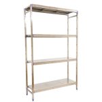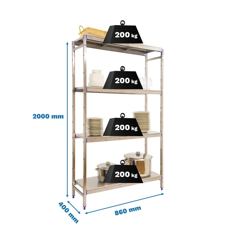 Estantería de acero inoxidable que aguanta hasta 30º bajo cero y es perfecta para la organización y manipulación de alimentos. Esta Estantería tiene 4 estantes y sus bandejas tienen una capacidad de carga de 200 kgs cada una. El montaje es muy sencillo y rápido con su sistema sin tornillos y tiene unas dimensiones de 2000x860x400 mms.