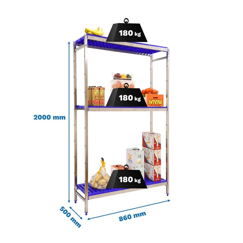 Estantería de acero inoxidable y bandejas de polipropileno que aguanta hasta 30º bajo cero y es perfecta para la organización y manipulación de alimentos. Esta Estantería tiene 3 estantes y sus bandejas tienen una capacidad de carga de 180 kgs cada una. El montaje es muy sencillo y rápido con su sistema sin tornillos y tiene unas dimensiones de 2000x860x500 mms.