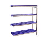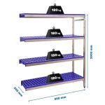 Estantería adicional de acero inoxidable y bandejas de polipropileno que aguanta hasta 30º bajo cero y es perfecta para la organización y manipulación de alimentos.El módulo adicional necesita uno inicial para completar su instalación. Esta Estantería tiene 4 estantes y sus bandejas tienen una capacidad de carga de 180 kgs cada una. El montaje es muy sencillo y rápido con su sistema sin tornillos y tiene unas dimensiones de 2000x860x500 mms.