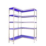 Estantería de acero inoxidable en forma de L y con bandejas de polipropileno que aguanta hasta 30º bajo cero y es perfecta para la organización y manipulación de alimentos.