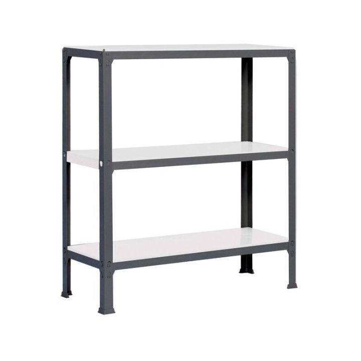 Estantería metálica sin tornillos con bandeja de aglomerado, de color ANTRACITA/BLANCO.