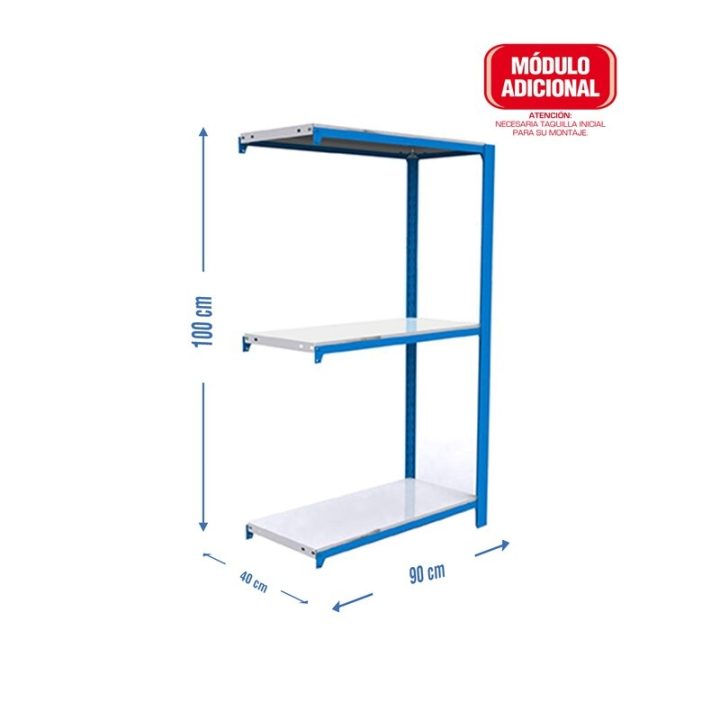 Estantería metálica sin tornillos con bandeja metálica, de color AZUL/BLANCO. Módulo adicional (requiere módulo inicial). Tiene 3 estantes. Las dimensiones de esta Estantería son: 1000x900x400 mm. Y tiene una capacidad de carga de 200 kgs por estante. Es fabricado en España y se monta rápido siguiendo las instrucciones.