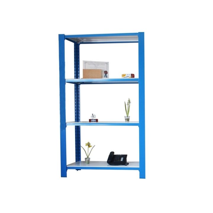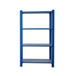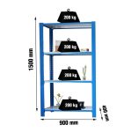 Estantería metálica sin tornillos con bandeja de aglomerado, de color AZUL/BLANCO.Tiene 4 estantes. Las dimensiones de esta Estantería son: 1500x900x400 mm. Y tiene una capacidad de carga de 200 kgs por estante. Es fabricado en España y se monta rápido siguiendo las instrucciones.