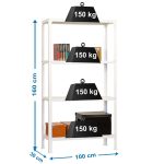 Es rigida. No necesita anclaje a la pared. Estanterías sin tornillos. La manera más fácil y rápida de montaje. Estanterías con topes para no rayar el suelo. Capacidad de carga de 150 kgs por bandeja metalica. Montaje en menos de 9 min. Packagin con peso ligero. Gran variedad de coloresColor del producto BLANCO. Dimensiones 1600x1000x300. Nº estantes 4