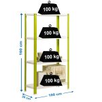 Es rigida. No necesita anclaje a la pared. Estanterías con tornillos avellanados con un mejor diseño. La manera más fácil y rápida de montaje. Estanterías con topes para no rayar el suelo. Capacidad de carga de 100 kgs por bandeja metalica. Montaje en menos de 9 min. Packagin con peso ligero. Gran variedad de colores Color del producto VERDE/BLANCO. Dimensiones 1600x1000x300. Nº estantes 4