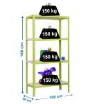 Es rigida. No necesita anclaje a la pared. Estanterías sin tornillos. La manera más fácil y rápida de montaje. Estanterías con topes para no rayar el suelo. Capacidad de carga de 150 kgs por bandeja metalica. Montaje en menos de 9 min. Packagin con peso ligero. Gran variedad de coloresColor del producto VERDE/BLANCO. Dimensiones 1600x1000x300. Nº estantes 4