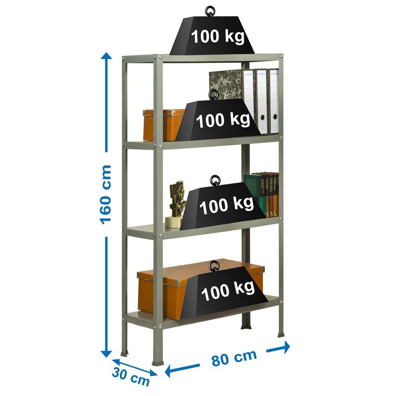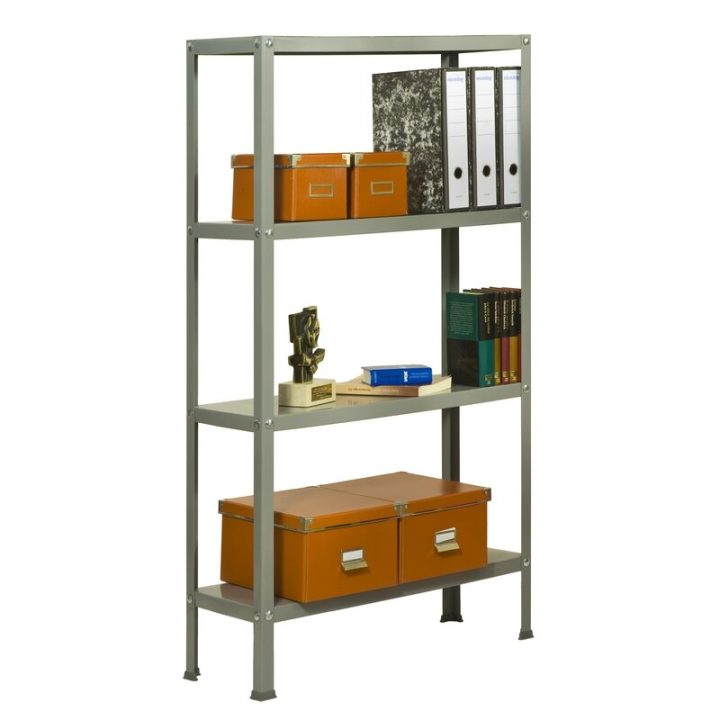 Es rigida. No necesita anclaje a la pared. Estanterías con tornillos avellanados con un mejor diseño. La manera más fácil y rápida de montaje. Estanterías con topes para no rayar el suelo. Capacidad de carga de 100 kgs por bandeja metalica. Montaje en menos de 9 min. Packagin con peso ligero. Gran variedad de colores Color del producto GRIS/GRIS. Dimensiones 1600x800x300 . Nº estantes 4