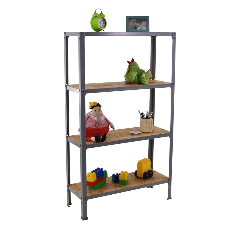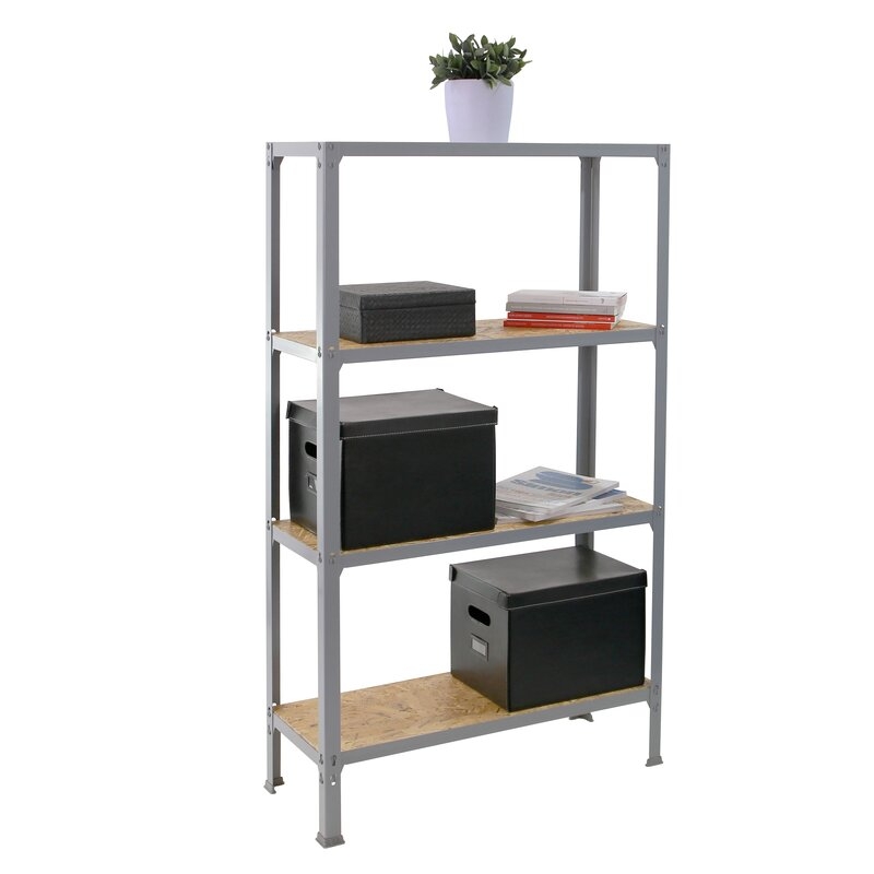Estantería metálica sin tornillos y con bandejas de madera OSB , ideal para el hogar. Sistema de montaje fácil y rápido. Montaje en menos de 12 minutos. Color del producto GRIS/OSB. La bandeja de OSB ofrece una alta resistencia, no tiene nudos, huecos u otros tipos de puntos débiles como pueden tener las bandejas contrachapadas, además resiste a la humedad y actúa como aislante térmico. Tiene 4 estantes. Las dimensiones de esta estantería son (alto x ancho x fondo): 1600x800x300 mm. Es rigida y tiene recubrimiento Epoxypoliester antirayaduras e innífugo. No necesita anclaje a la pared. Se pueden ajustar sus estantes en altura y combinarlos como se desee. Estantería con 4 pies para no rayar el suelo. Capacidad de carga de 150 kgs por estante, certificada a punto de flexión. Packaging con peso ligero. Disponible en otros colores. Producto fabricado en España.