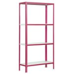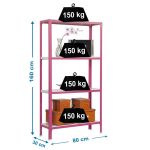 Es rigida. No necesita anclaje a la pared. Estanterías sin tornillos. La manera más fácil y rápida de montaje. Estanterías con topes para no rayar el suelo. Capacidad de carga de 150 kgs por bandeja metalica. Montaje en menos de 9 min. Packagin con peso ligero. Gran variedad de coloresColor del producto ROSA/BLANCO. Dimensiones 1600x800x300 . Nº estantes 4