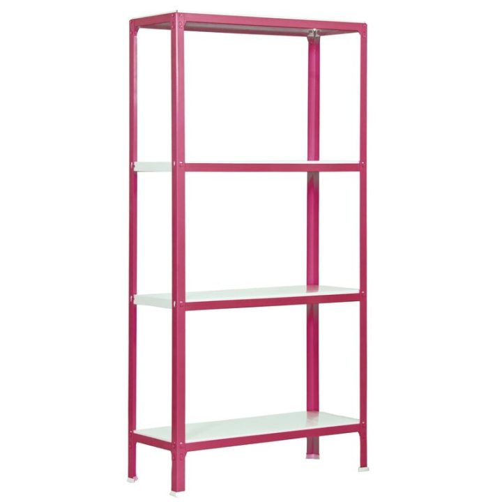 Es rigida. No necesita anclaje a la pared. Estanterías sin tornillos. La manera más fácil y rápida de montaje. Estanterías con topes para no rayar el suelo. Capacidad de carga de 150 kgs por bandeja metalica. Montaje en menos de 9 min. Packagin con peso ligero. Gran variedad de coloresColor del producto ROSA/BLANCO. Dimensiones 1600x800x400 . Nº estantes 4