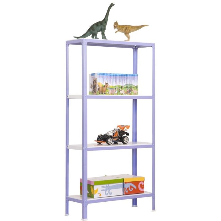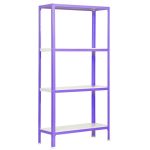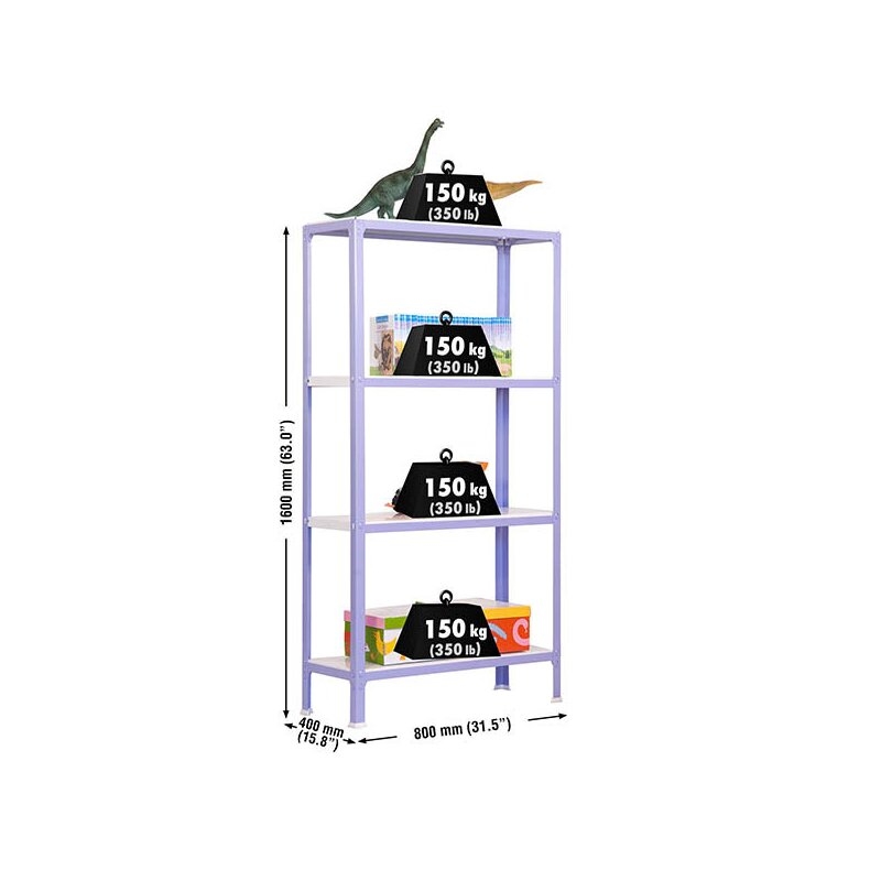 Es rigida. No necesita anclaje a la pared. Estanterías sin tornillos. La manera más fácil y rápida de montaje. Estanterías con topes para no rayar el suelo. Capacidad de carga de 150 kgs por bandeja metalica. Montaje en menos de 9 min. Packagin con peso ligero. Gran variedad de coloresColor del producto VIOLETA/BLANCO. Dimensiones 1600x800x400 . Nº estantes 4