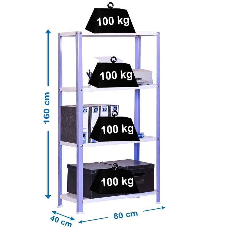 Es rigida. No necesita anclaje a la pared. Estanterías con tornillos avellanados con un mejor diseño. La manera más fácil y rápida de montaje. Estanterías con topes para no rayar el suelo. Capacidad de carga de 100 kgs por bandeja metalica. Montaje en menos de 9 min. Packagin con peso ligero. Gran variedad de colores Color del producto VIOLETA/BLANCO. Dimensiones 1600x800x400 . Nº estantes 4