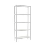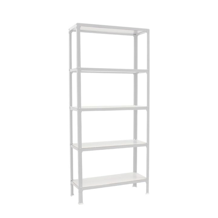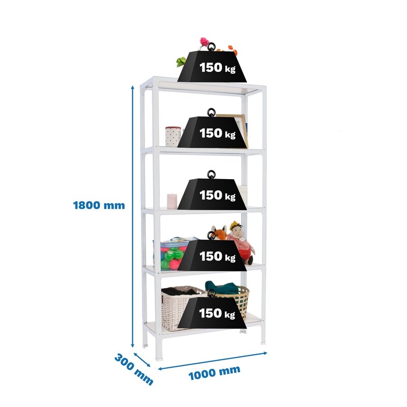 Estantería metálica sin tornillos y con bandejas de aglomerado, ideal para el hogar. Montaje en menos de 12 minutos. Color del producto BLANCO/BLANCO. Tiene 5 estantes. Las dimensiones de esta estantería son (alto x ancho x fondo): 1800x1000x300 mm. Es rigida y tiene recubrimiento Epoxypoliester antirayaduras e innífugo. No necesita anclaje a la pared. Se pueden ajustar sus estantes en altura y combinarlos como se desee. Estantería con 4 pies para no rayar el suelo. Capacidad de carga de 150 kgs por estante, certificada a punto de flexión. Packaging con peso ligero. Disponible en otros colores. Producto fabricado en España.