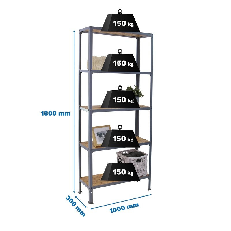 Estantería metálica sin tornillos y con bandejas de madera OSB , ideal para el hogar. Sistema de montaje fácil y rápido. Montaje en menos de 12 minutos. Color del producto GRIS/OSB. La bandeja de OSB ofrece una alta resistencia, no tiene nudos, huecos u otros tipos de puntos débiles como pueden tener las bandejas contrachapadas, además resiste a la humedad y actúa como aislante térmico. Tiene 5 estantes. Las dimensiones de esta estantería son (alto x ancho x fondo): 1800x1000x300 mm. Es rigida y tiene recubrimiento Epoxypoliester antirayaduras e innífugo. No necesita anclaje a la pared. Se pueden ajustar sus estantes en altura y combinarlos como se desee. Estantería con 4 pies para no rayar el suelo. Capacidad de carga de 150 kgs por estante, certificada a punto de flexión. Packaging con peso ligero. Disponible en otros colores. Producto fabricado en España.