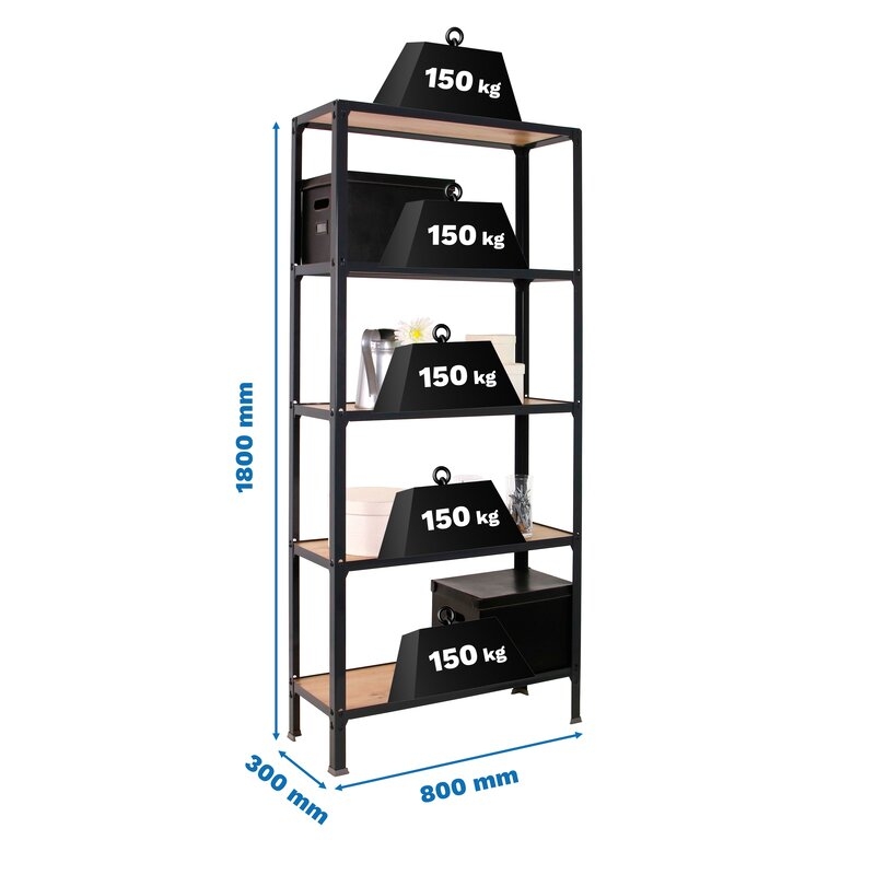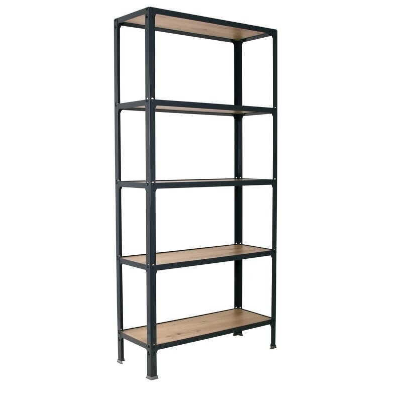 Estantería metálica sin tornillos y con bandejas de aglomerado, ideal para el hogar. Montaje en menos de 12 minutos. Color del producto ANTRACITA/ROBLE. Tiene 5 estantes. Las dimensiones de esta estantería son (alto x ancho x fondo): 1800x800x300 mm. Es rigida y tiene recubrimiento Epoxypoliester antirayaduras e innífugo. El color antracita es un color muy demandado en decoración actualmente. No necesita anclaje a la pared. Se pueden ajustar sus estantes en altura y combinarlos como se desee. Estantería con 4 pies para no rayar el suelo. Capacidad de carga de 150 kgs por estante, certificada a punto de flexión. Packaging con peso ligero. Disponible en otros colores. Producto fabricado en España.