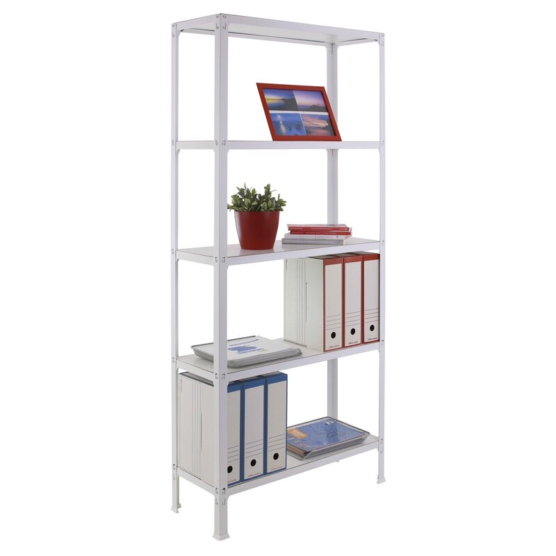 Estantería metálica sin tornillos y con bandejas de aglomerado, ideal para el hogar. Montaje en menos de 12 minutos. Color del producto BLANCO/BLANCO. Tiene 5 estantes. Las dimensiones de esta estantería son (alto x ancho x fondo): 1800x800x300 mm. Es rigida y tiene recubrimiento Epoxypoliester antirayaduras e innífugo. No necesita anclaje a la pared. Se pueden ajustar sus estantes en altura y combinarlos como se desee. Estantería con 4 pies para no rayar el suelo. Capacidad de carga de 150 kgs por estante, certificada a punto de flexión. Packaging con peso ligero. Disponible en otros colores. Producto fabricado en España.