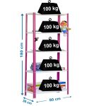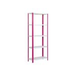 Es rigida. No necesita anclaje a la pared. Estanterías con tornillos avellanados con un mejor diseño. La manera más fácil y rápida de montaje. Estanterías con topes para no rayar el suelo. Capacidad de carga de 100 kgs por bandeja metalica. Montaje en menos de 9 min. Packagin con peso ligero. Gran variedad de colores Color del producto ROSA/BLANCO. Dimensiones 1800x800x300 . Nº estantes 5