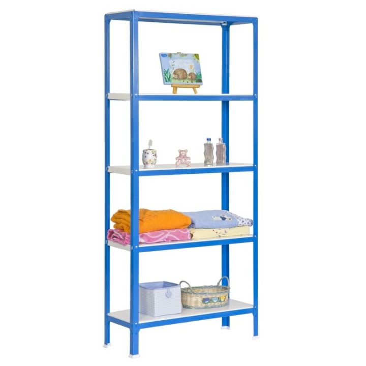 Es rigida. No necesita anclaje a la pared. Estanterías sin tornillos. La manera más fácil y rápida de montaje. Estanterías con topes para no rayar el suelo. Capacidad de carga de 150 kgs por bandeja metalica. Montaje en menos de 9 min. Packagin con peso ligero. Gran variedad de coloresColor del producto AZUL/BLANCO. Dimensiones 1800x800x400 . Nº estantes 5