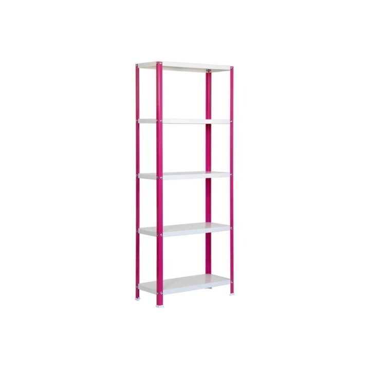 Es rigida. No necesita anclaje a la pared. Estanterías con tornillos avellanados con un mejor diseño. La manera más fácil y rápida de montaje. Estanterías con topes para no rayar el suelo. Capacidad de carga de 100 kgs por bandeja metalica. Montaje en menos de 9 min. Packagin con peso ligero. Gran variedad de colores Color del producto ROSA/BLANCO. Dimensiones 1800x800x400 . Nº estantes 5
