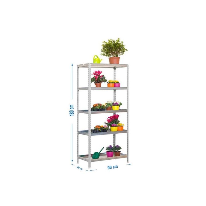 Estantería metálica sin tornillos, de color GALVANIZADO/GALVANIZADO.Tiene 5 estantes. Las dimensiones de esta Estantería son: 1800x900x400 mm. Tiene una capacidad de carga de 180 kgs por estante. Incluye bandejas perforadas para que se filtre el agua. Incluye una bandeja lisa para contener el agua. Es fabricado en España y se monta rápido siguiendo las instrucciones.