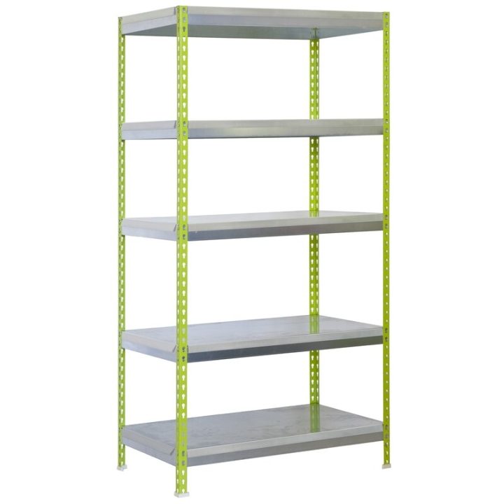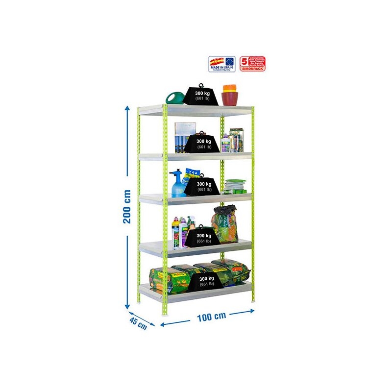 Estantería metálica sin tornillos, de color VERDE/GALVANIZADO.Tiene 5 estantes. Las dimensiones de esta Estantería son: 2000x1000x450 mm. Tiene una capacidad de carga de 300 kgs por estante y una capacidad total de 120 kgs. Ideal para almacenar productos de jardín. Gran capacidad de carga. Es fabricado en España y se monta rápido siguiendo las instrucciones.