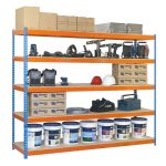 Estantería media carga sin tornillos Ecoforte 2000x1200x450 mm. De color AZUL/NARANJA/MADERA. La capacidad de carga es de 400 kgs.