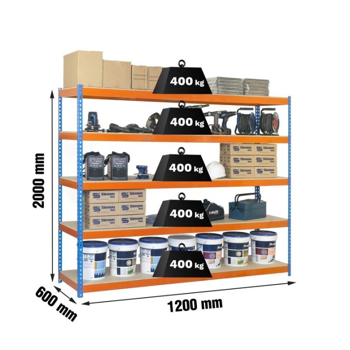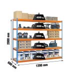 Estantería media carga sin tornillos Ecoforte 2000x1200x600 mm. De color AZUL/NARANJA/MADERA. La capacidad de carga es de 400 kgs.