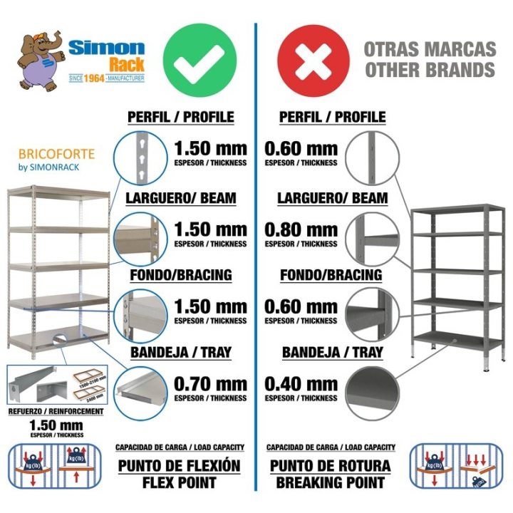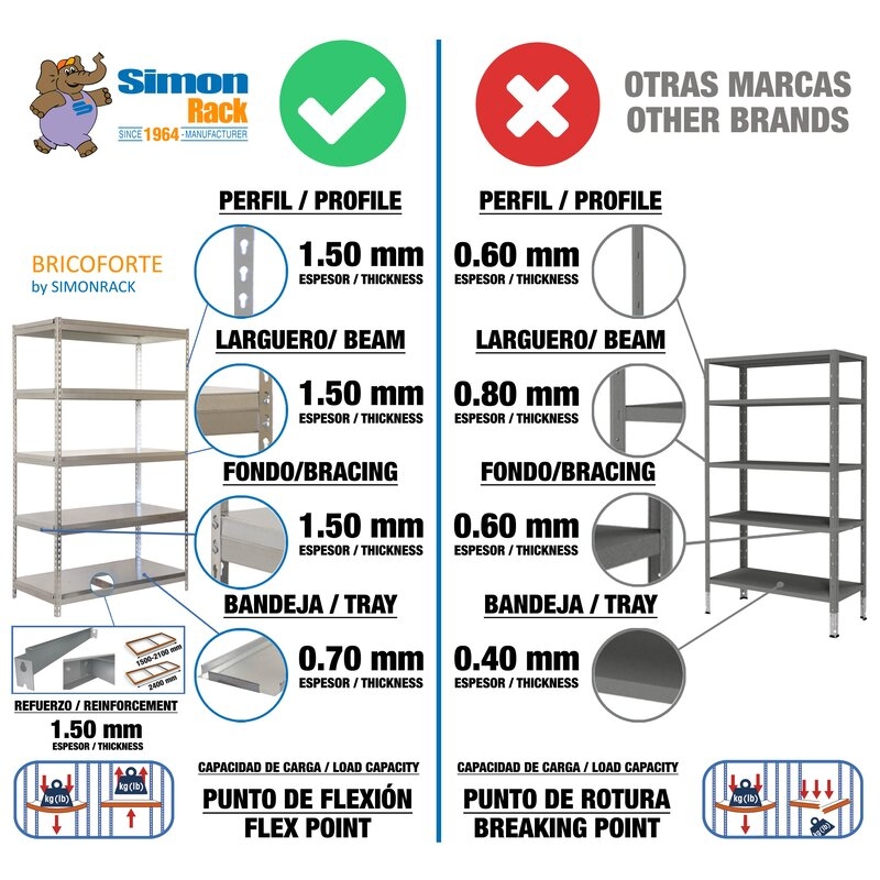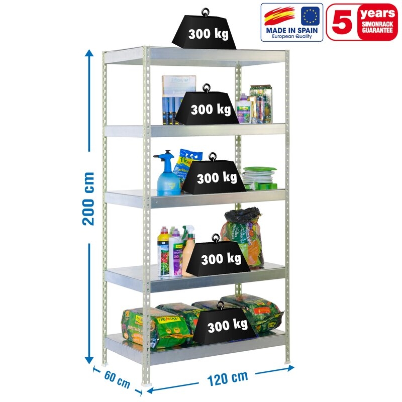 Estantería metálica sin tornillos con bandeja metálica, de color GALVA/GALVA.Tiene 5 estantes. Las dimensiones de esta Estantería son: 2000x1200x600 mm. Y tiene una capacidad de carga de 300 kgs. Estantería rígida, no se tambalea y no necesita anclaje a la pared. Es fabricado en España y se monta rápido siguiendo las instrucciones.