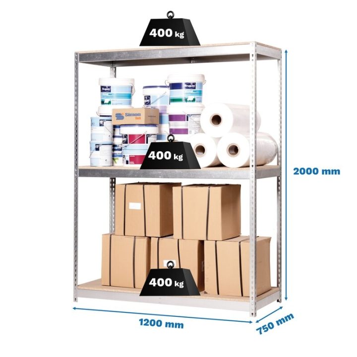 Estantería media carga sin tornillos Ecoforte 2000x1200x750 mm. De color GALVA/MADERA. La capacidad de carga es de 400 kgs.