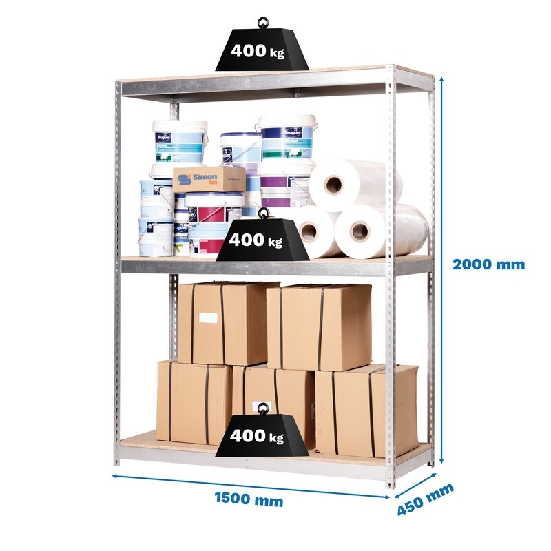 Estantería media carga sin tornillos Ecoforte 2000x1500x450 mm. De color GALVA/MADERA. La capacidad de carga es de 400 kgs.