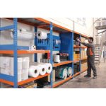 Estantería media carga sin tornillos Ecoforte 2000x1500x600 mm. De color AZUL/NARANJA/GALVA. La capacidad de carga es de 400 kgs.