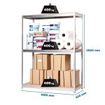 Estantería media carga sin tornillos Ecoforte 2000x1800x450 mm. De color GALVA/MADERA. La capacidad de carga es de 400 kgs.