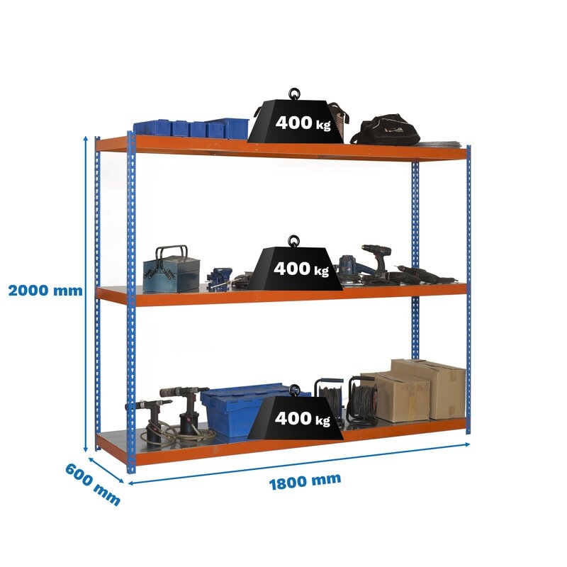 Estantería media carga sin tornillos Ecoforte 2000x1800x600 mm. De color AZUL/NARANJA/GALVA. La capacidad de carga es de 400 kgs.