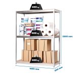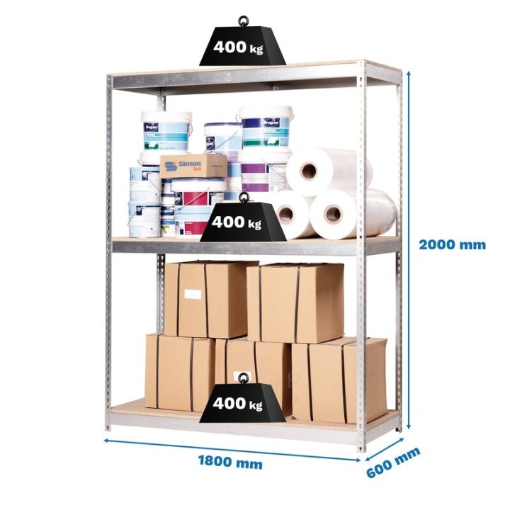 Estantería media carga sin tornillos Ecoforte 2000x1800x600 mm. De color GALVA/MADERA. La capacidad de carga es de 400 kgs.