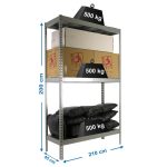 Estantería media carga sin tornillos 2000x2100x450 mm. De color GALVA/GALVA. La capacidad de carga es de 500 kgs por estante.