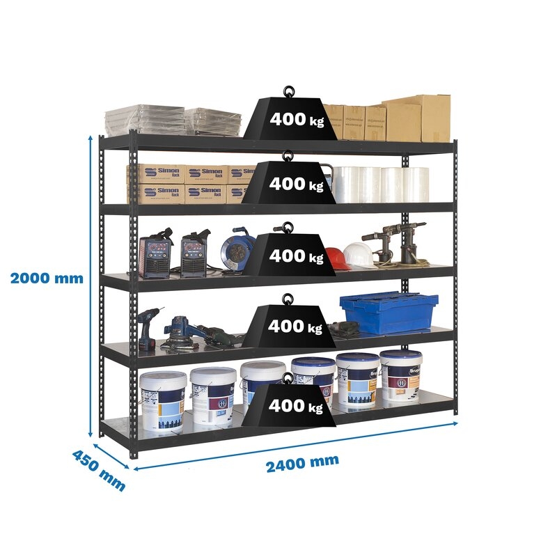 Estantería media carga sin tornillos 2000x2400x450 mm. De color ANTRACITA/GALVA.