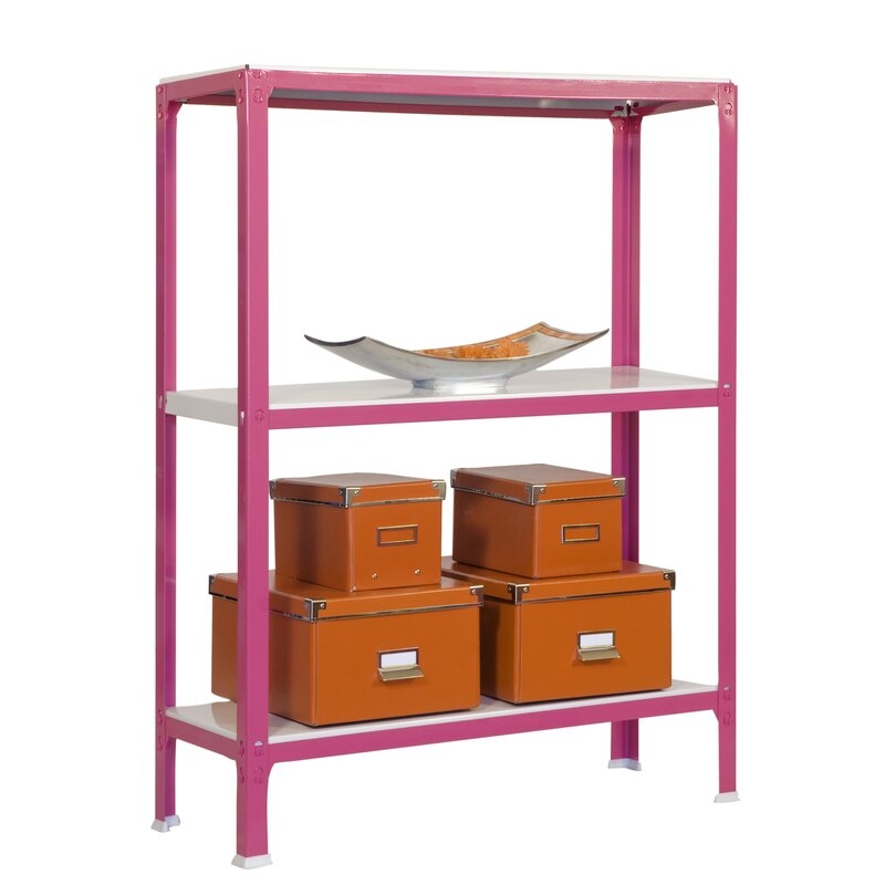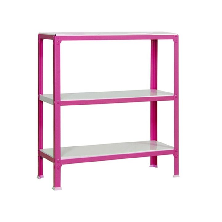 Es rigida. No necesita anclaje a la pared. Estanterías sin tornillos. La manera más fácil y rápida de montaje. Estanterías con topes para no rayar el suelo. Capacidad de carga de 150 kgs por bandeja metalica. Montaje en menos de 9 min. Packagin con peso ligero. Gran variedad de coloresColor del producto ROSA/BLANCO. Dimensiones 900x1000x300 . Nº estantes 3