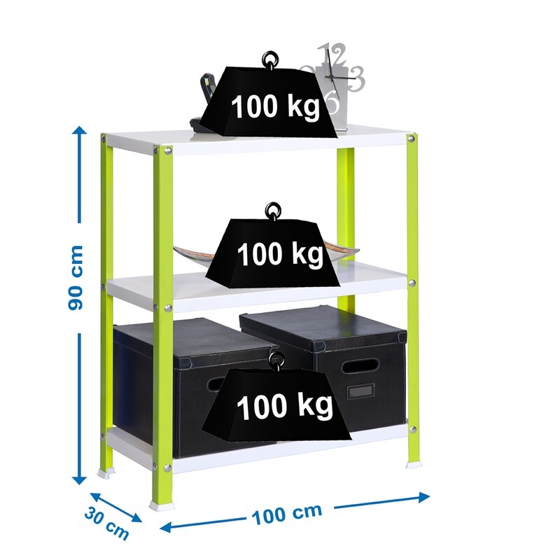 Es rigida. No necesita anclaje a la pared. Estanterías con tornillos avellanados con un mejor diseño. La manera más fácil y rápida de montaje. Estanterías con topes para no rayar el suelo. Capacidad de carga de 100 kgs por bandeja metalica. Montaje en menos de 9 min. Packagin con peso ligero. Gran variedad de colores Color del producto VERDE/BLANCO. Dimensiones 900x1000x300 . Nº estantes 3