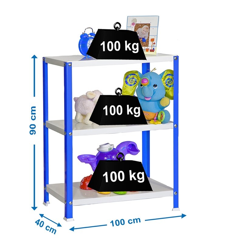 Es rigida. No necesita anclaje a la pared. Estanterías con tornillos avellanados con un mejor diseño. La manera más fácil y rápida de montaje. Estanterías con topes para no rayar el suelo. Capacidad de carga de 100 kgs por bandeja metalica. Montaje en menos de 9 min. Packagin con peso ligero. Gran variedad de colores Color del producto AZUL/BLANCO. Dimensiones 900x1000x400 . Nº estantes 3